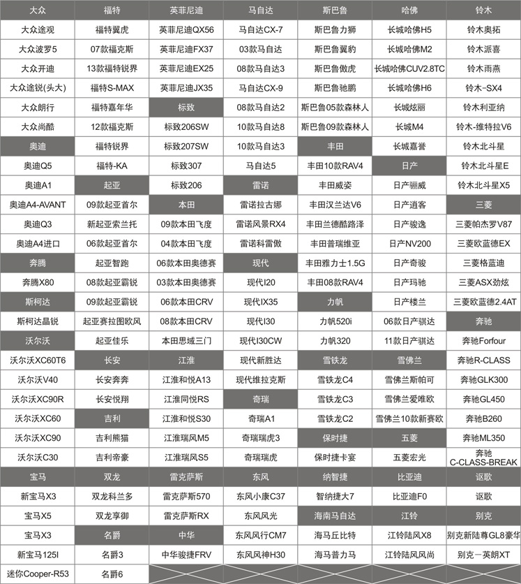 专车专用对应车型表